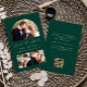 This simple, minimalist Save the Date card features a photo collage arch, with a horizontal photo at the top and two square photos below. Between the top and bottom photos, the words "Save the Date" appear in elegant gold-coloured handwriting script, followed by the couple's names, wedding date and city in sans serif font on an emerald green background. Add a more detailed message with additional information on the back, along with a QR code to help your guests visit your wedding website.