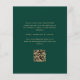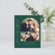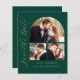 This simple, minimalist Save the Date card features a photo collage arch, with a horizontal photo at the top and two square photos below. The words "Save the Date" run vertically up the left margin in elegant gold-coloured handwriting script. The couple's names, wedding date and city appear below the photo collage in sans serif font on an emerald green background. Add a more detailed message with additional information on the back, along with a QR code to help your guests visit your wedding website.