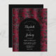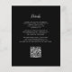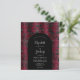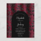 This elegant design features a moody background image of vintage faux velvet floral damask pattern in burgundy and black. Personalise it with the names of the bride and groom in silver grey calligraphy script and the remaining text in a combination of sans serif, copperplate and italics on a black arch shape. The reverse side provides space for wedding details on a solid black background, along with a QR code guests can scan to visit your website and RSVP.