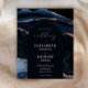 This modern design features a dark blue arch shape on a background of navy blue watercolor agate trimmed with rose gold faux glitter. The word "wedding" appears in elegant white script. Personalise the invitation with the names of the bride and groom in a combination of serif and sans serif typography and the wedding details in italics.