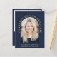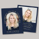 Elegant and budget-friendly dark blue graduation party invitation featuring the grad's photo in an arch frame, "Congrats To Our Graduate" in gold serif typography and their name, school and class year in simple gold typography. On the back, add an additional photo and personalise your party details.