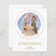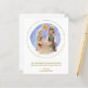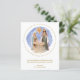 Budget Away In A Manger Nativity Christmas Card. A budget price SMALLER 4.5” x 5.6” flat card for your festive greetings on a shiny SEMI GLOSS 110 lb card stock (similar to the thickness of a postcard) PLEASE NOTE: The envelope supplied with this card is slightly larger than the card itself. A beautiful painted Nativity Scene, with Mary, Joseph and baby Jesus in a manger, and the lyrics to the first verse of Away In A Manger circled completely around the picture in gold on a fresh white background and a square format for a contemporary feel. On the back, easily personalise with your greeting and names.
