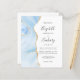 The left-hand edge of this elegant modern wedding invitation features a pastel baby blue watercolor agate border trimmed with faux gold glitter. The customisable text combines handwriting, copperplate and italic fonts in charcoal grey on a white background. The reverse side provides space for wedding details on a solid white background, along with a QR code guests can scan to visit your website and RSVP.