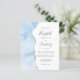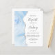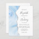 The left-hand edge of this elegant modern wedding invitation features a pastel baby blue watercolor agate border trimmed with faux silver glitter. The customisable text combines handwriting, copperplate and italic fonts in charcoal grey on a white background. The reverse side provides space for wedding details on a solid white background, along with a QR code guests can scan to visit your website and RSVP.