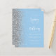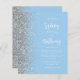 The left-hand edge of this elegant modern wedding invitation features a silver faux glitter border. The customisable text combines white calligraphy script and sans serif font on a pastel baby blue background. The reverse side features a matching baby blue and silver design.