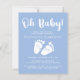 Cute and budget-friendly blue baby boy shower invitation with "Oh Baby!" in a white script and a coordinating white watercolor of baby feet. You can easily personalise the shower details.