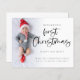 PLEASE NOTE there is ONE card per sheet. Baby First Christmas Custom Photo Card. A budget price SMALLER 4.5” x 5.6” flat card for your festive greetings on a shiny SEMI GLOSS 110 lb card stock (similar to the thickness of a postcard) PLEASE NOTE: The envelope supplied with this card is slightly larger than the card itself. Lovely to celebrate your baby's first Christmas. A playful set script for Christmas and the rest of the text is easy to personalise. Replace the sample photo with your own. A gradient overlay layer is on top of your photo so it fades out as it reaches the center with the text partially overlaid on top.