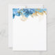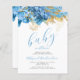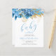 This sweet baby shower invitation features a top border of blue and gold flowers and foliage. Below, the words "baby in bloom" appear in elegant blue handwriting script. Personalise the text with the name of the mum-to-be in blue script and the details in charcoal grey sans serif font on a white background.