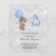 For a baby shower celebrating a baby boy. A faux silver metallic looking background. A teddy bear holding a blue balloon stars and faux glitter dust. Personalise and add the name of the mum to-be and party details. The name and the text: Oh Boy! are written with a hand lettered style script