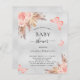 For a modern boho style baby shower. A faux silver looking background. Decorated with rose gold and pink florals, roses, pampas grass and butterflies. Personalise and add a name and party details.