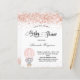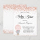For a baby shower, celebrating a baby girl. A white background. Decorated with blush, rose gold faux glitter dust, and a cute little baby elephant girl in a hot air balloon. Personalise and add the name of the mum to-be's name and party details. The name and the text: Baby Shower are written with a hand lettered style script