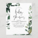 Budget Greenery Botanical Watercolor Spring Baby Shower Invitations on green and white background - includes beautiful and elegant script typography with modern botanical leaves and greenery for the special Mother to Be celebration.