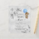 For a modern boho style baby shower. A faux silver looking background. Decorated with non-coloured roses, pampas grass and a teddy bear boy holding a light blue balloon. Personalise and add a name and party details.