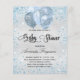 A faux silver metallic looking background. Decorated with blue faux glitter dust and balloons. Personalise and add a name, age and party details. The name is written with a hand lettered style script