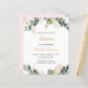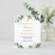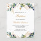 A white background decorated with eucalyptus greenery and golden leaves. Personalise and the child's name and ceremony details. Black and golden coloured letters.
