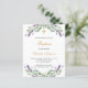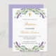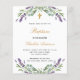 A white background decorated with lavender flowers and eucalyptus greenery. Personalise and a name and ceremony details. Black and golden coloured letters.