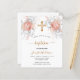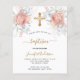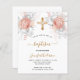 For an elegant baptism, celebrating a baby girl. A chic white background. Decorated with rose gold and white florals, roses and a faux gold cross. Personalise and add the name of the child and details. Black and golden letters.