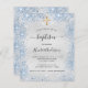 A modern, elegant baptism, celebrating a baby boy. Faux silver looking background decorated with blue faux glitter dust and a golden cross. Personalize and add a name and party details. Black colored letters.