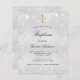 A modern, elegant and minimalist baptism invitation for both boys or girls. Faux silver metallic looking background decorated with faux glitter dust. Personalise and add a name and details. Black coloured letters.