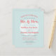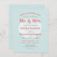 This beach wedding invitation features the words "Sandy Toes & Salty Kisses," "Mr. & Mrs.," and the bride and groom's names in bold coral pink typography over a vintage white illustration of scallop shell on a subtle aqua blue background.
