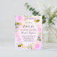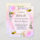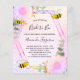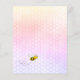 Elegant, fun, summer bridal shower invitation. A rainbow coloured background in pink, purple and golden with a honeycomb pattern. A geometric frame. Decorated with flowers and eucalyptus greenery and happy bumble bees. With the text: Bride to Bee and the name of the bride on front written with a modern hand lettered style script. Black letters.