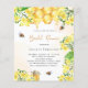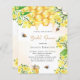 A stylish white and golden watercolored background. Decorated with bumble bees, melting honey and honeycomb with yellow florals, flowers and a honey jar. With the text: Bridal Shower written with a modern hand lettered style script. Personalize and add the name of the bride to bee. Golden and black letters.