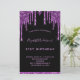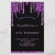 A girly and feminine 21st (or any age) birthday party invitation. On front: A chic black background. Decorated with dark purple faux glitter drips, paint dripping look. Personalise and add a name and party details. The name is written with a hand lettered style script, light purple coloured letters.