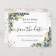 A trendy Save the Date for a 40th (or any age) birthday party. A stylish white background decorated with eucalyptus, greenery, golden foliage and faux gold glitter dust. Personalize and add a date, name and text. The text: Save the Date is written with a large trendy hand lettered style script with swashes.