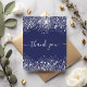 A navy blue background colour. Decorated with faux silver glitter dust. On front large white hand lettered script and the text: Thank You.