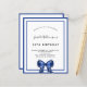 A modern, elegant and invitation. A white background decorated with navy blue frames and a bow. Personalise and add a name and details. Black coloured letters.
