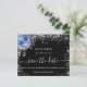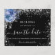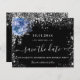 A girly and trendy Save the Date card for a 50th (or any age) birthday party. A classic black background decorated with faux silver glitter dust and blue flowers. Personalise and add a date and name/age. The text: Save the Date is written with a large trendy hand lettered style script.