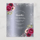 On front: An invitation for a 50th birthday party. A dark faux silver metallic looking background. Decorated with dark purple and burgundy and rose pink watercolored flowers. Templates for a name and party details. The name is written with a hand lettered style script, light grey coloured letters. Perfect for a winter party!