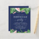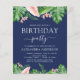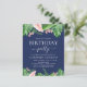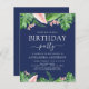 Budget Green Tropical Palms, Navy Blue Background and Blush Pink Floral Flowers Watercolor Birthday Party Invitations includes beautiful and elegant script typography with modern botanical blush pink flowers and tropical Hawaiian greenery for the special 16th, 18th, 21st, 30th, 40th, 50th, 60th, 70th birthday celebration.