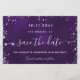 A glamourous Save the Date card for a 50th (or any age) birthday party. A purple uneven coloured background. Decorated with faux silver glitter dust. The text: Save the Date is written with a large trendy hand lettered style script.