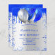 A faux silver looking background. Decorated with royal blue faux glitter drips paint dripping look, sparkles and balloons. Personalise and add a name and party details. The name is written with a hand lettered style script.