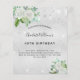 A modern, stylish and glamourous invitation for a woman's 40th (or any age) birthday party. A faux silver metallic looking background with faux silver glitter dust and white florals and greenery. The name is written with a modern black hand lettered style script. Personalise and add a name, age and your party details