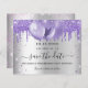 A faux silver looking background decorated with violet, lavender coloured faux glitter and balloons. Personalise and add a date and name/age. The text: Save the Date is written with a large trendy hand lettered style script.
