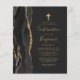 The left-hand edge of this elegant modern Confirmation invitation features a black watercolor agate border trimmed with faux gold glitter. A faux gold foil cross appears above the customisable text, which combines gold-coloured handwriting, copperplate and italic fonts on a slate black background. The reverse side features a matching black and gold agate design.