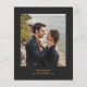 This elegant wedding design features a vertical photo of the couple softened with a white screen to highlight the text overlay. The left-hand edge features a black watercolor agate border trimmed with faux gold glitter. The customizable black text combines handwriting, copperplate and italic fonts. Easily replace the sample image on the back with a second vertical photo, and add a brief message with additional information such as your wedding website URL.