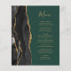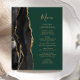 The left-hand edge of this elegant modern wedding menu features a black watercolor agate border trimmed with faux gold glitter. The customisable text combines gold-coloured handwriting script and copperplate fonts on a dark emerald green background. The reverse side features a matching black and gold agate design.