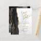 The left-hand edge of this elegant modern wedding save the date card features a black watercolor agate border trimmed with faux gold glitter. The customisable text combines gold-coloured handwriting, copperplate and italic fonts on a grey and white marble background. The reverse side features a matching black and gold agate design.