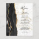 The left-hand edge of this elegant modern wedding menu features a black watercolor agate border trimmed with faux gold glitter. The customizable black text combines handwriting script and copperplate fonts on a gold and white marble texture background. The reverse side features a matching black and gold agate design.