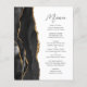 The left-hand edge of this elegant modern wedding menu features a black watercolor agate design trimmed with faux gold glitter. The customisable text combines charcoal grey handwriting script and sans serif fonts on a white background. The black and gold agate design is repeated on the reverse side.