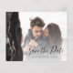 This elegant horizontal save the date card features a black watercolor agate border trimmed with faux rose gold glitter. Easily replace the sample images with your own photos of the future bride and groom. The customisable text combines black handwriting script and copperplate font over your photo on the front; a white gradient filter helps make the text pop. The back provides spaces for five additional photos, along with room for your wedding website URL or other brief message in rose pink text on an off-black background.
