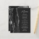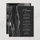 The left-hand edge of this elegant modern wedding menu features a black watercolor agate design trimmed with faux silver glitter. The customisable text combines silver grey handwriting script and sans serif fonts on a dark slate black background. The black and silver agate design is repeated on the reverse side.