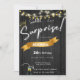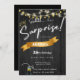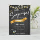 The simple, minimal black and white, surprise birthday party digital invitation with wooden background and gold plate.