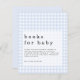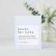 A budget price SMALLER 4.5” x 5.6” alternative. The SATIN FINISH 80 lb IS A THINNER PAPER STOCK (ideal for enclosures), alternatively Available in a SEMI GLOSS 110 lb CARD STOCK (ideal for invitations). Envelopes are an optional extra and are slightly larger than the card size. Blue Gingham Books for Baby enclosure. Baby Boy. The header is large in stylish lowercase with the details at the bottom on an opacity layer overlaid onto the gingham background. Easily personalise the text to your own details.