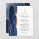 The left-hand edge of this elegant modern Confirmation invitation features a navy blue watercolor agate border trimmed with faux gold glitter. A faux gold foil cross appears above the customizable text, which combines script, copperplate and italic fonts in charcoal gray on a white background. The reverse side features a matching blue and gold agate design.