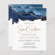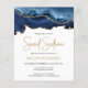 This trendy Sweet Sixteen birthday invitation features a watercolor image of an agate geode in shades of blue with faux gold highlights. The words "Sweet Sixteen" appear in faux gold glitter in decorative modern handwriting font. Customise it with the name of the guest of honour in gold coloured text and the details in charcoal grey on a white background. The same blue agate image appears on the reverse side.