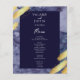 Abstract Blue Gold Paint Marble Wedding Menu. Faux gold foil stone striations. Script font highlights with easy to read serif name font. Easy to adjust for your own wedding needs. Make your own menu, use your own text to create an elegant yet cheap and affordable event menu. Easy to personalise. Custom menu paper sheets.